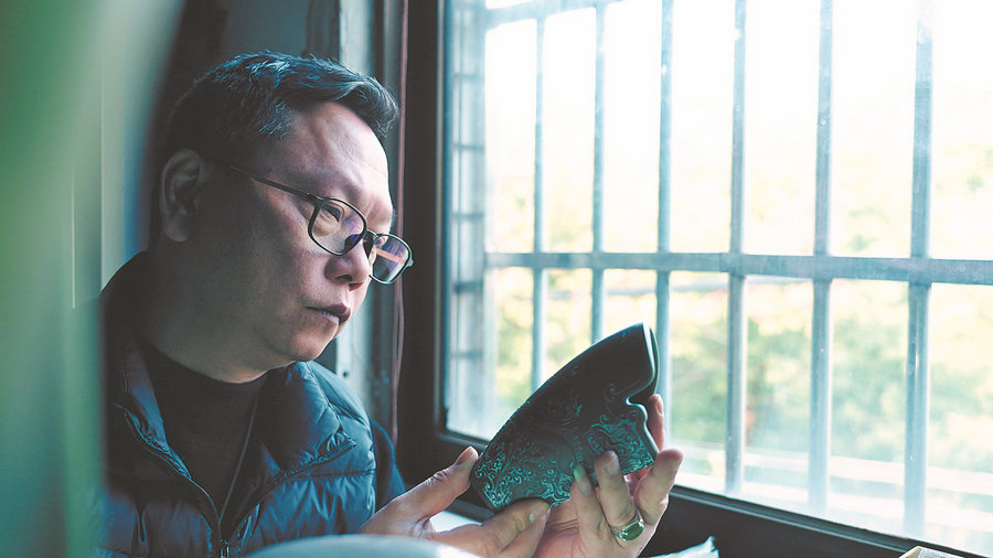 In his studio in western Suzhou, where his jade pieces are displayed, he arranges lights behind these vessels, so visitors can observe the thin surface with its delicately carved patterns, and the glossy, even inner walls.