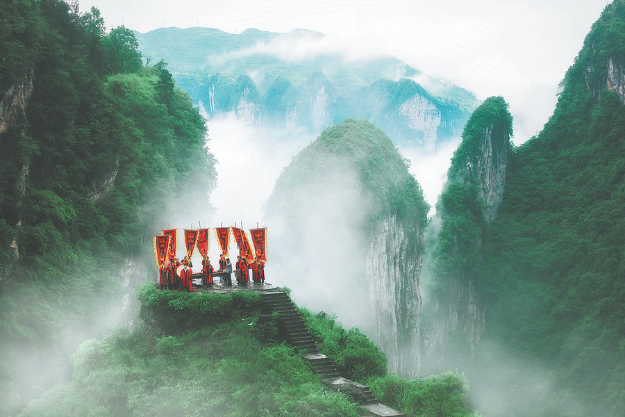 In the Tianzi Mountain area, a local guide pointed to a sandstone pillar, explaining to the crowd: "Over there, you can see a pine resembling a peacock with its tail spread, standing beside three smaller rocks beneath which is a larger rock. The entire formation resembles a boat. That's a famous attraction, 'Stone Boat Sailing Out to Sea'. It is particularly stunning when surrounded by clouds. That is the Wuling pine, a descendant of the horsetail pine. It is remarkably resilient."