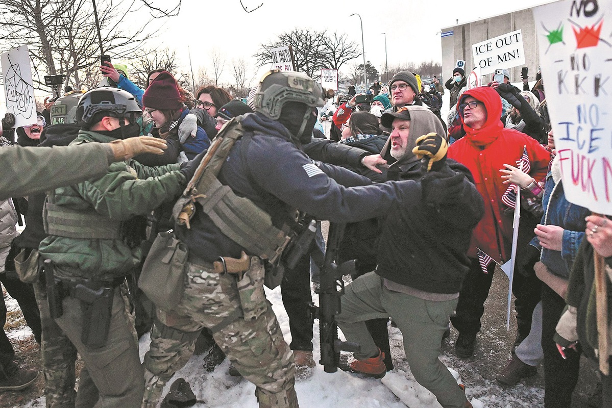 Protesters clash with federal agents in Saint Paul on Jan 8. OCTAVIO JONES/AFP
