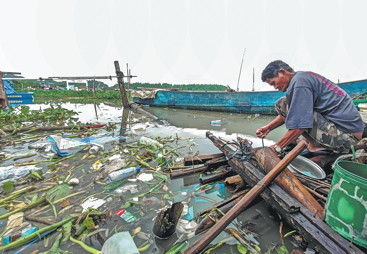 A man makes a water barrier to avoid plastic waste spillage inside their store in Laguna de Bay in the Philippines on July 26. GETTY IMAGES