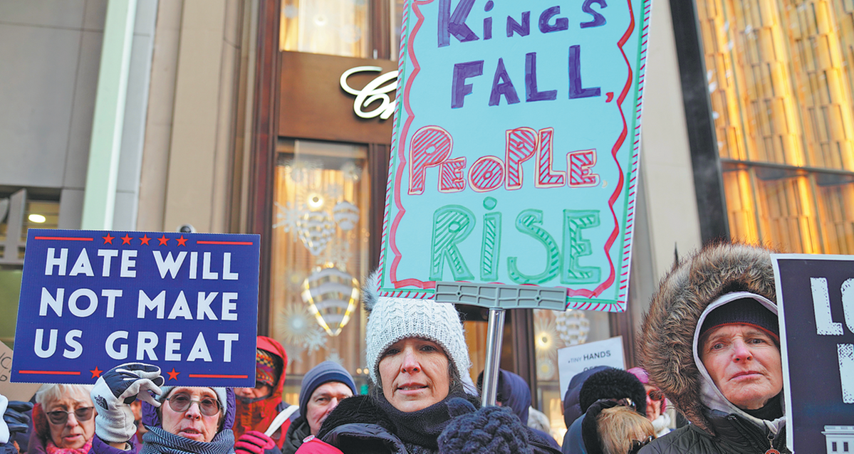 People attend a protest in New York on Tuesday, as rallies were held at multiple locations against US policies such as the arrest of undocumented immigrants and military intervention. ZHANG FENGGUO/XINHUA