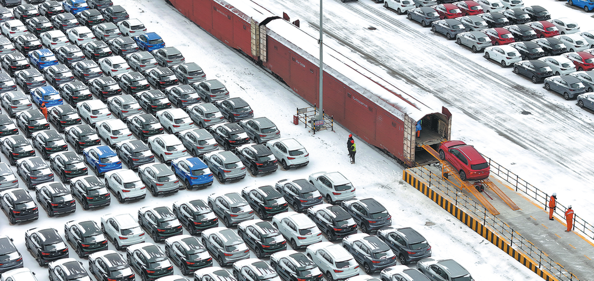 China-made cars are unloaded from a train in Yantai port for export from Shandong province on Jan 18. TANG KE/FOR CHINA DAILY