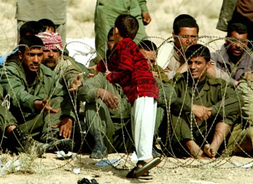 | | An Iraqi boy tosses a cigarette to Iraqi prisoners of war alongside a road leading to the southern Iraq city of Basra March 23, 2003. Fierce air strikes shook Baghdad on Monday but Iraqi fighters, buoyed by US and British setbacks, stalled forces trying to sweep north to the capital. Picture taken March 23. [Reuters] |