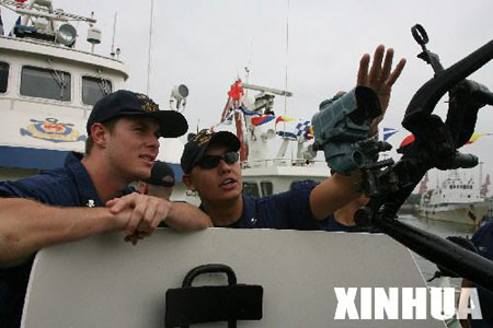 兩位美國(guó)海警在參觀中國(guó)海警裝備