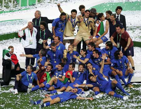Italy's Fabio Cannavaro holds the World Cup Trophy as he celebrates with team mates after the World Cup 2006 final soccer match between Italy and France in Berlin July 9, 2006. (Reuters)